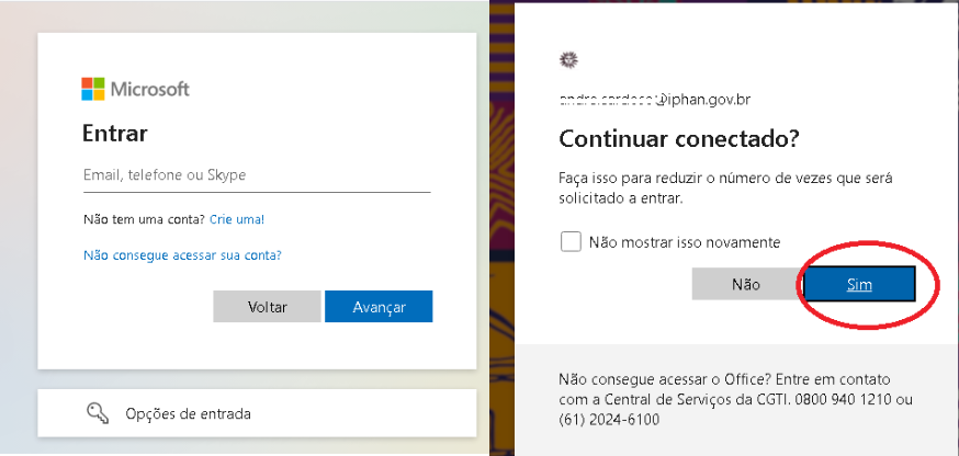 Passo 2: Inserir as credenciais do Webmail Iphan e clicar em “Avançar”. Exemplo: nome.sobrenome@iphan.gov.br